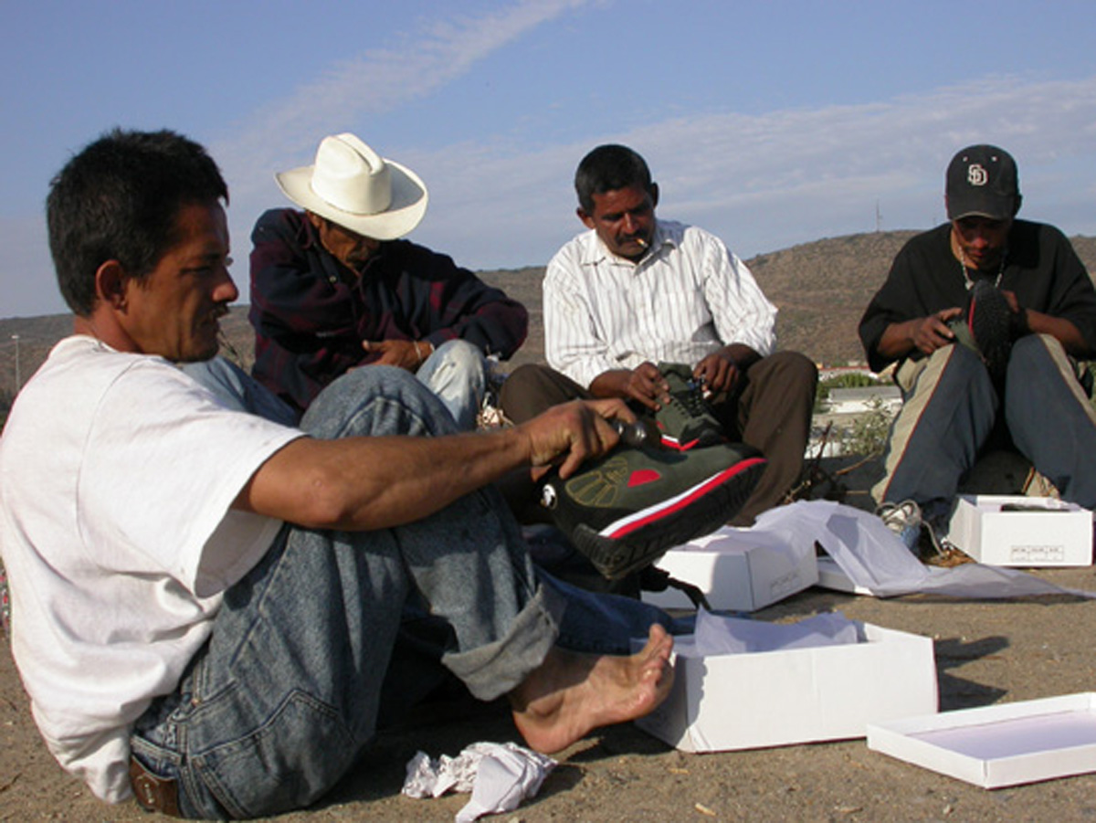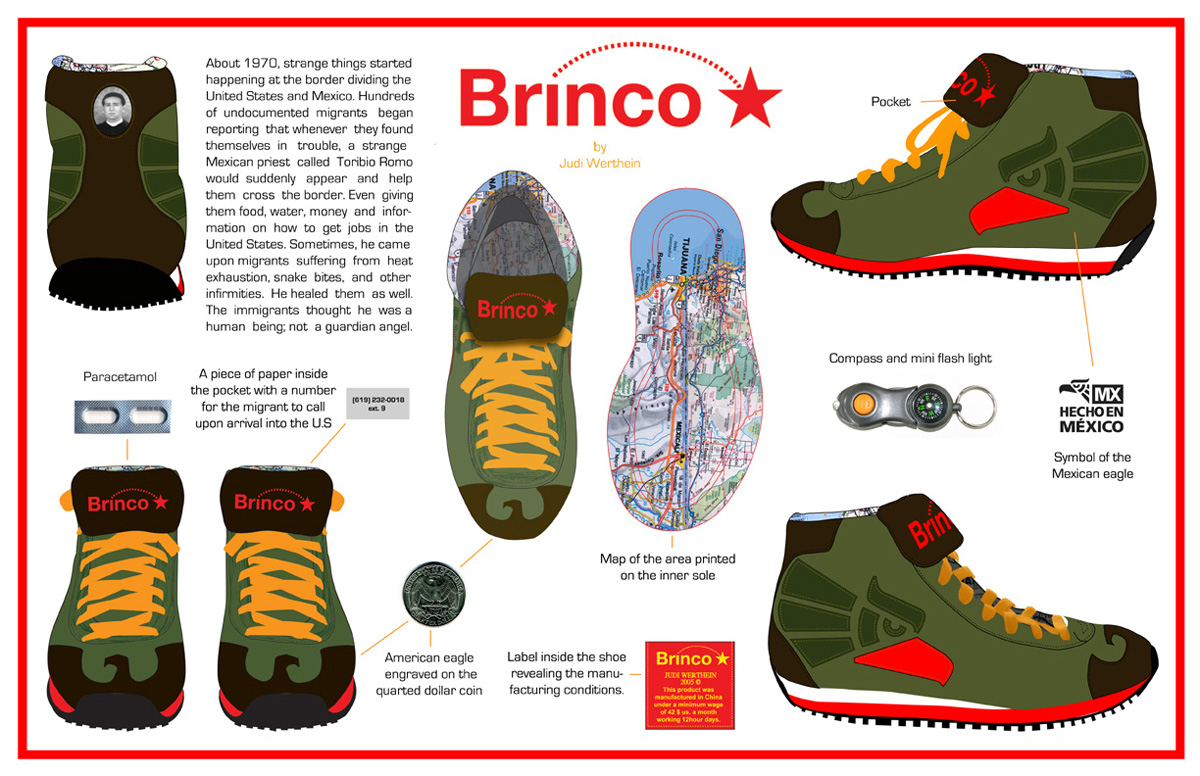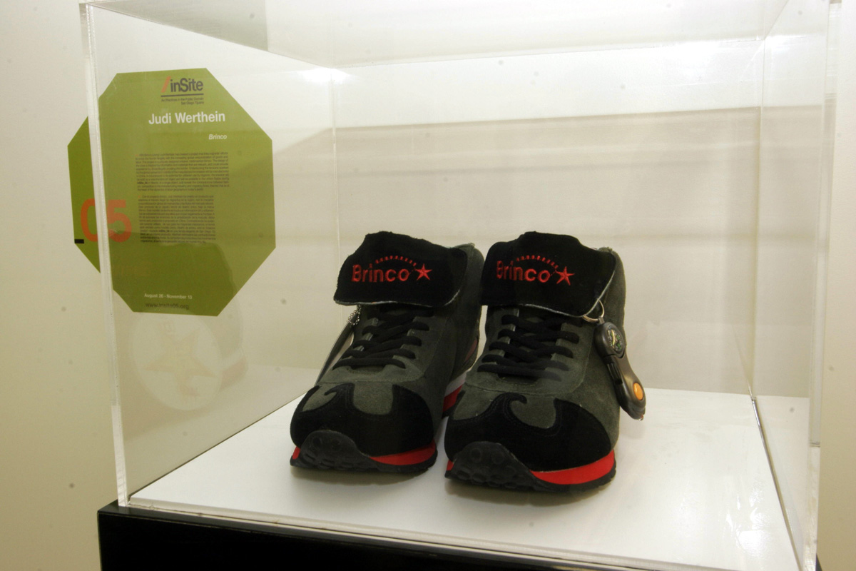 Judy Werthein artist, created the Brinco Sneakers for an exhibit at the San Diego Museum of Art in August 2005. Werthein wanted to draw attention to the difficulties endured by migrants crossing the desert to the U.S.. The sneakers include a compass, a map of the crossing area and a visible tag stating they were made in China to draw attention to the unfair labor practices there.