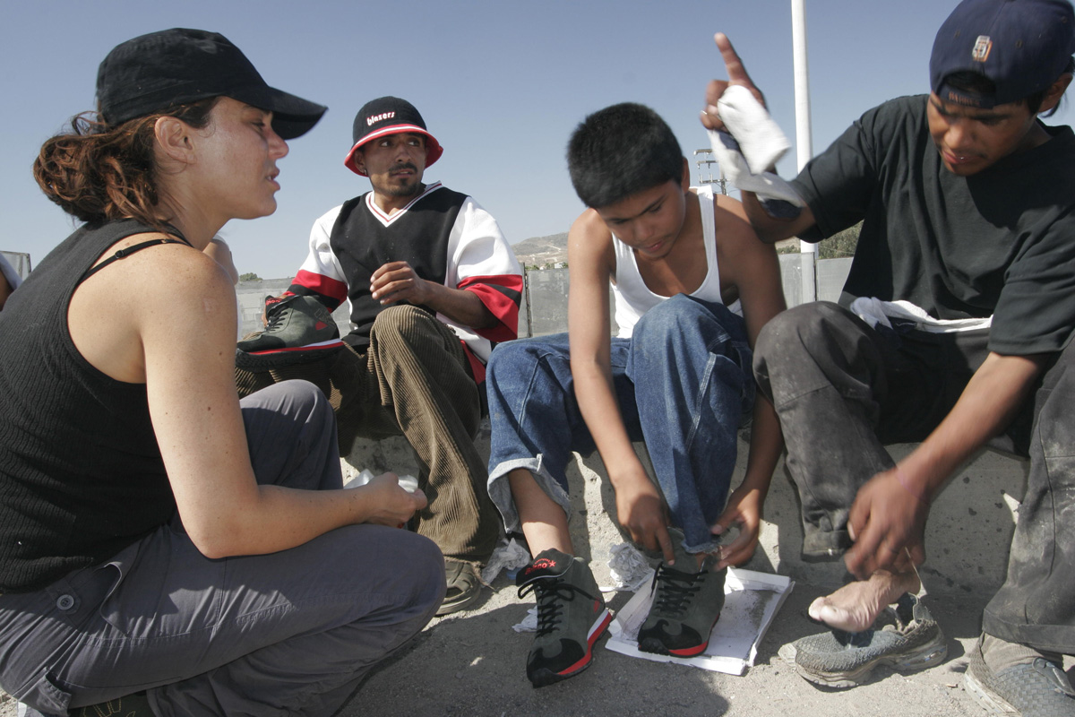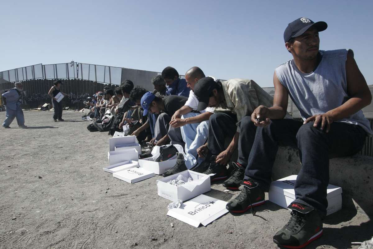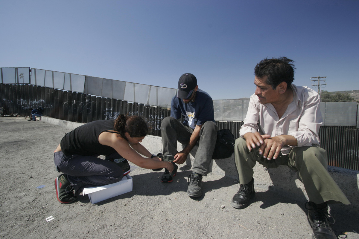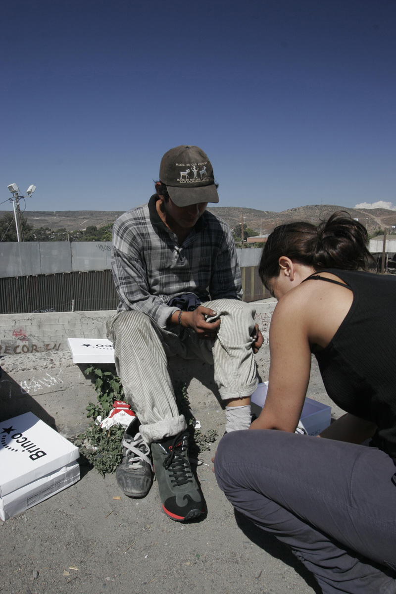 Elle offre des tennis aux Mexicains qui se préparent à passer côté américain.