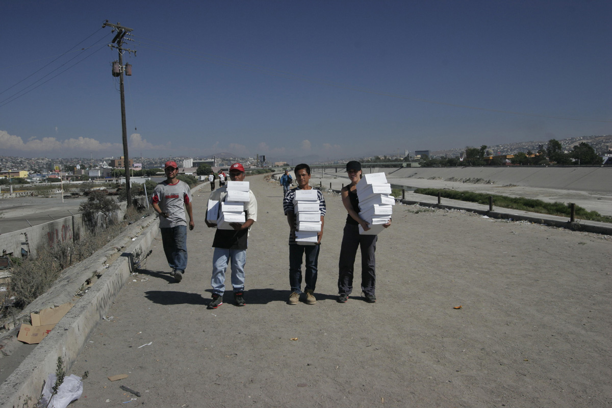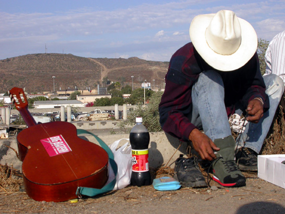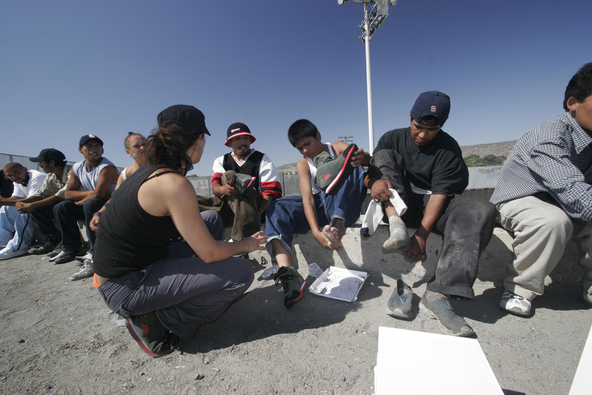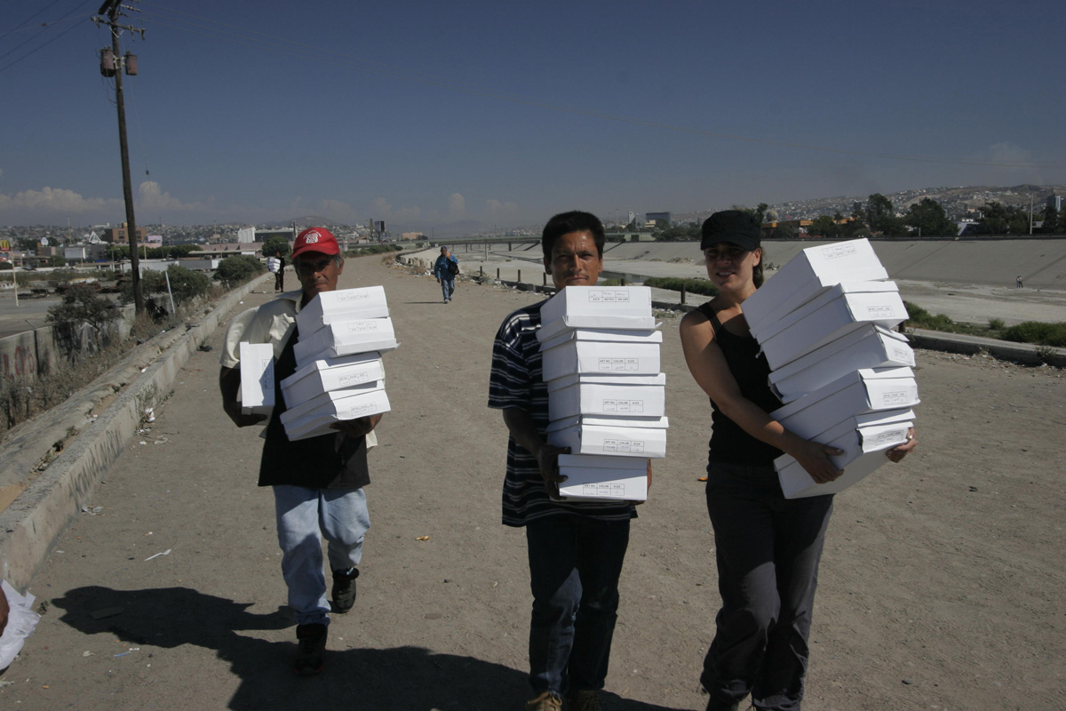 Elle offre des tennis aux Mexicains qui se préparent à passer côté américain.