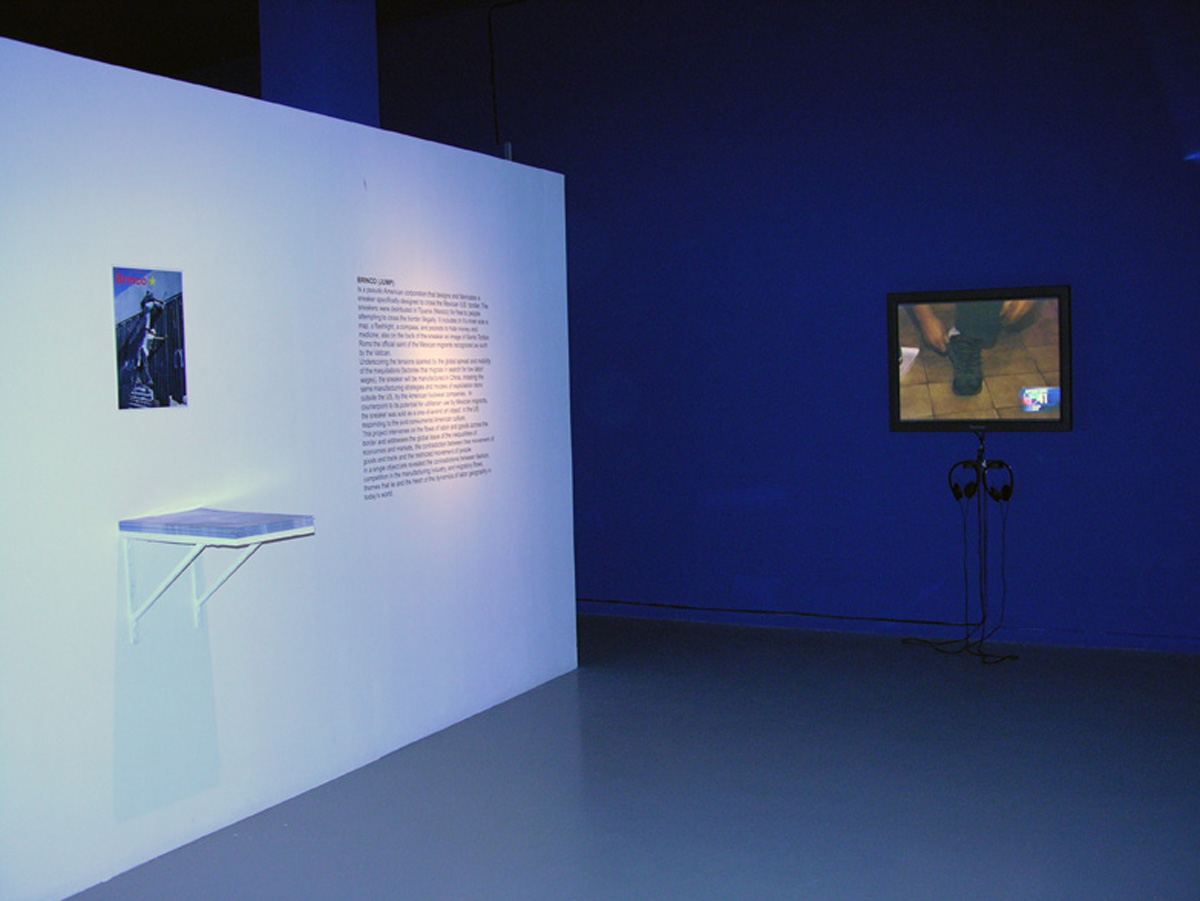Underscoring the tensions sparked by the global spread and mobility of the maquiladoras (factories that migrate in search for low labor wages), a thousand pairs of sneakers were produced in China, imitating manufacturing strategies and models of exploitation outside the US in low-wage economies by American footwear companies.